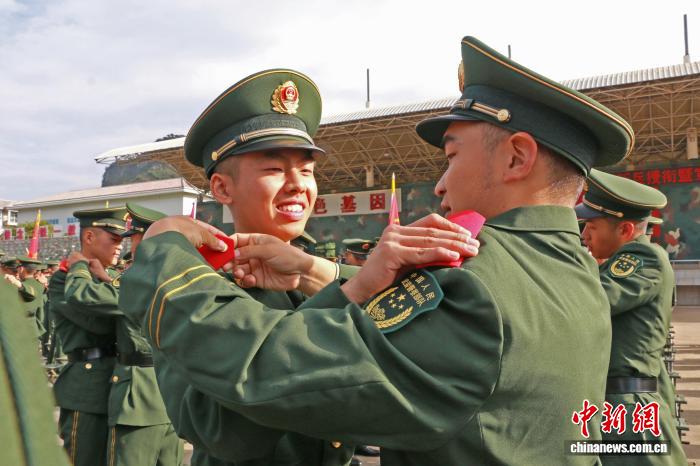图为新卒们彼此佩带警衔、收拾戎拆。唐背亮 摄